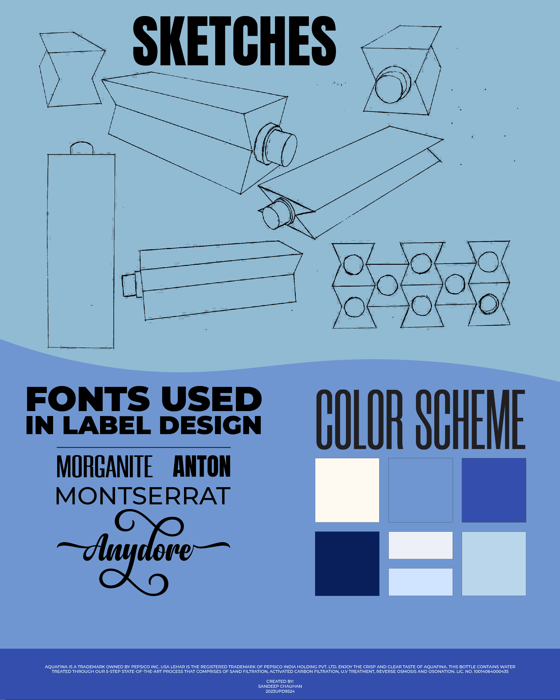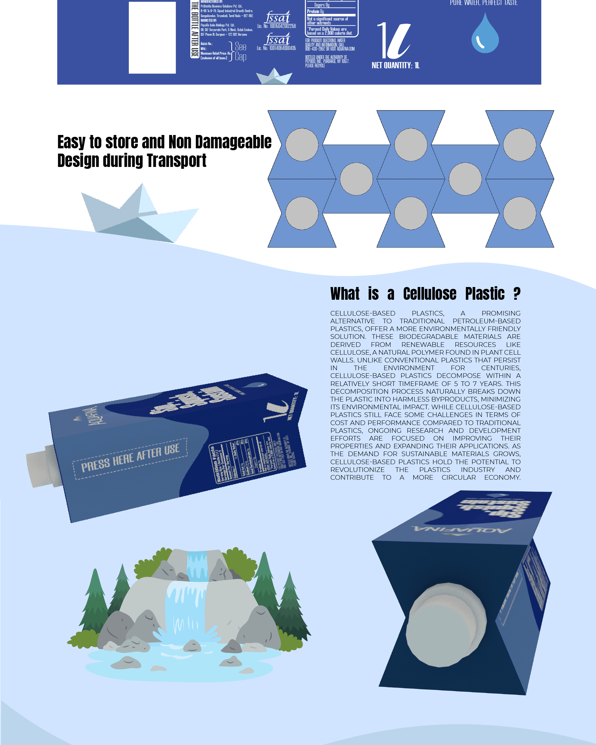This project explores a redesign of Aquafina’s iconic water bottle, addressing issues of sustainability, convenience, and consumer safety. The new compressible design reduces size by 60% after use, ensuring easy storage and transport. Using cellulose-based biodegradable plastic, it aims to reduce environmental impact while maintaining durability.To combat the widespread issue of refilling and resale of bottles, the design incorporates a breakable nozzle and crush mechanism, making each bottle single-use for consumer trust. Beyond packaging, the project focuses on circular design principles and practical usability.